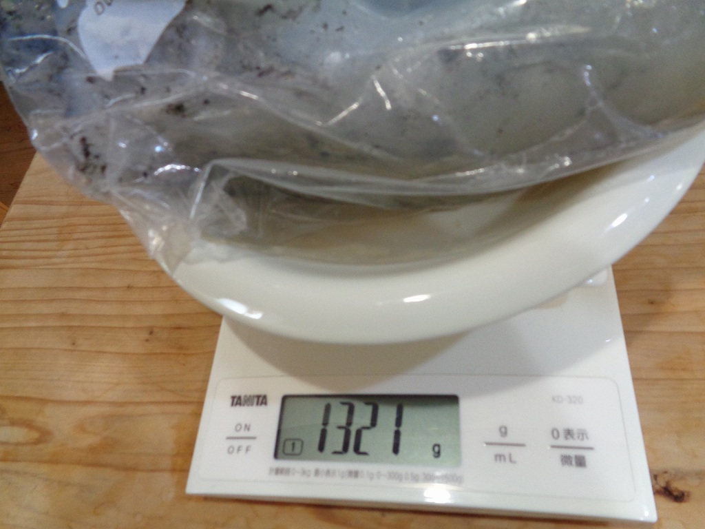 ※計りに皿を載せてから「0」にします。皿にイカを載せて1321g。ジップロックが12gなので1321から12を引いて、1309gです。