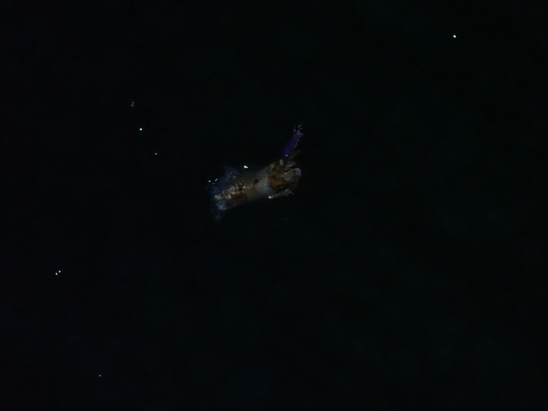 1杯目が午前1時前にヒットしました。水深7メートルのボトムにエギを放置していたら、しゃくりで乗って釣れました。最近のイカっ気の無さから、今夜イカが釣れるとは思ってなかったので、ライトで照らしてイカだと分かった時は嬉しかったです(途中までタコだろうと思ってました)。とは言え、小さいのでお帰りいただきました。