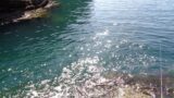 結構、疲れてましたが、イカ見たさに、おじさんが教えてくれた場所に行ってみました。そして海を見ると、いい感じで藻が生茂ってます。そして目を凝らすといました!推定1.5キロほどのイカ(おそらくオス)がホバリングしてます。その付近に一回り小さいイカ(おそらくメス)もいました。ペアになって産卵行動をしているのでしょう(または、これから始まる)。試しに少し離れた場所にエギを投げてみましたが、デカイカは全く見向きもしません。