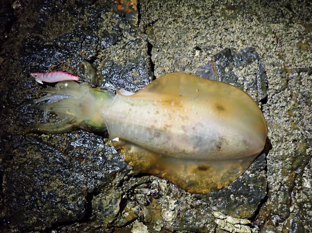 その数少ないチャンスをモノにしてセイさんが見事に850gを釣りました。夏イカ850gは立派です。釣られたのは実力です。実力が無いと「釣れるイカも釣れないもの」です。そのあと、ドンジーさんが150g前後を釣りました。お2人とも私と違って(笑)、集中されてました。この地磯で短時間の釣行だと、このくらいの釣果が精いっぱいと考えていいです。良いポイントでも、そのタイミングで、イカがいないと釣れません。