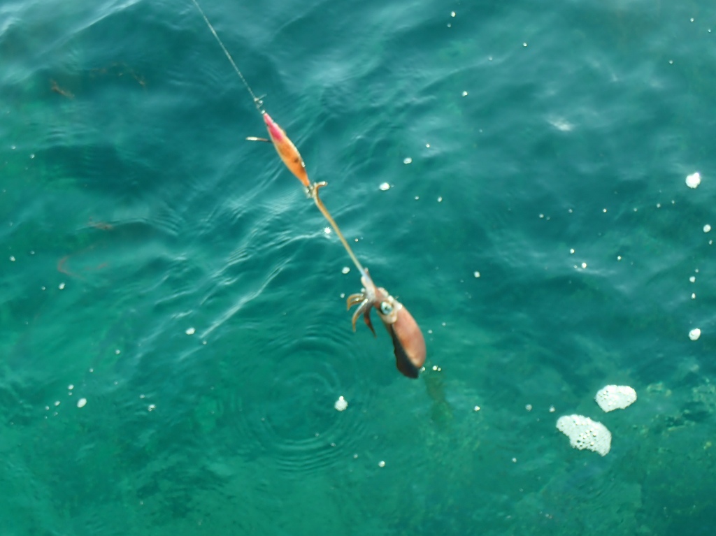見えてきたイカはそこそこ良きサイズでした。ギャフをかけて取り込みました。このくらいのサイズだと引きが強くて楽しめます。イカを磯の上に置くと、エギを横抱きして離しません。よほど、このエギが気に入ったのでしょう。
