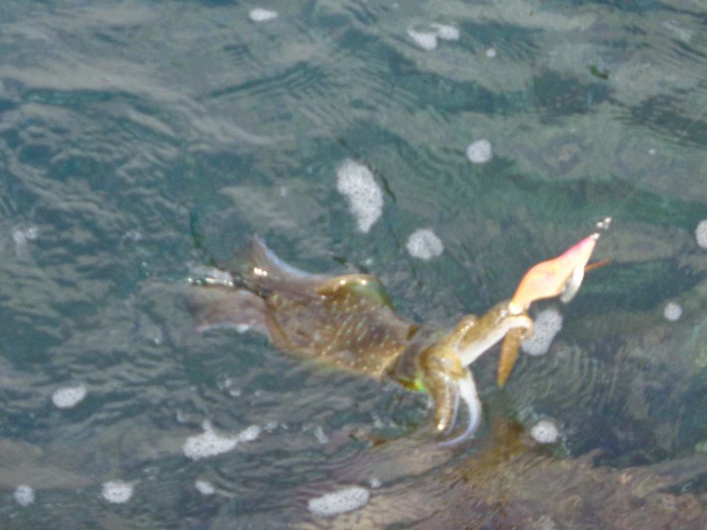 その他、推定500gほどのイカが深場から岸際の表層までエギに付いてきました。エギをじっと眺めたのち、後ろに消えていきました。今日は深場でしかイカを見なかったです。